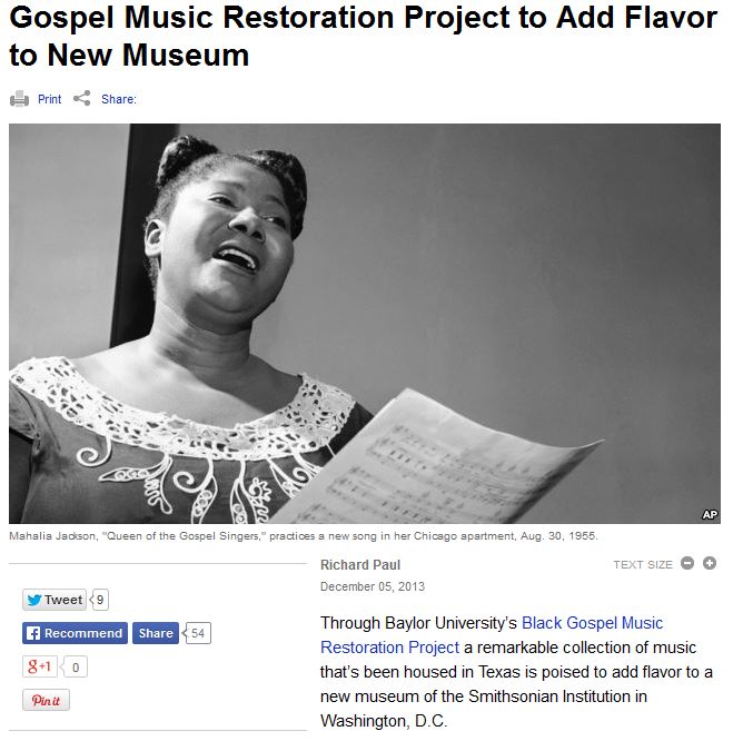 (Article Image and Excerpt from Gospel Music Restoration Project to Add Flavor to New Museum, Voice of America, December 5, 2013)